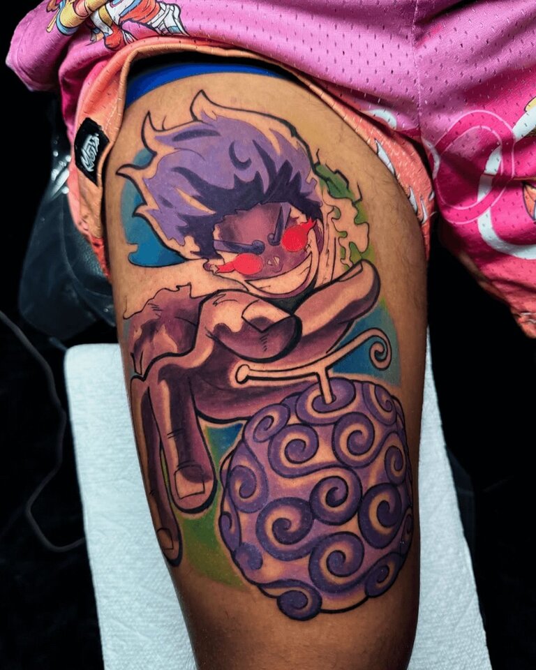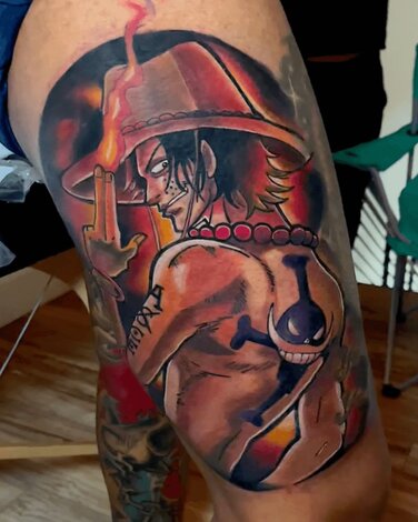Vickii’s anime tattoos stand out for their clean lines and bold color. Her work reflects anime’s playful, expressive style while keeping each piece sharp and defined.