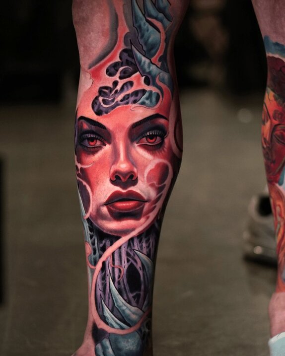 I’ve been tattooing for about 14 years. My style has evolved from realism, particularly color realism, which I was passionate about early on. Studying oil painting from life helped me refine my technical skills, especially with color. These days, I’m exploring new subject matter, still avoiding strict labels for my style, allowing my art to grow naturally.