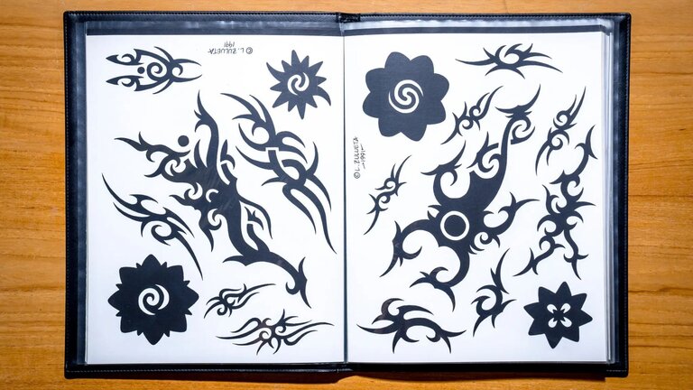 Contemporary tribal tattooing has origins in the late 1970s. Don Ed Hardy's issue of Tattoo Time from 1982 "New Tribalism" documented the history, spanning centuries, of indigenous practice throughout the Pacific Rim and positioned tribal tattooing as one of the major categories of tattooing alongside traditional, Japanese, and fine line/black and gray. Designs from Borneo, Samoa, and Fiji inspired Leo Zulueta, who began his career in 1981, to develop his own vernacular. Known as the "father of modern tribal tattooing," Zulueta helped to popularize this (new/neo) approach to tribal tattooing, which removed spiritual context, from his famed studio, Spiral Tattoo. Eventually, this version of tribal was watered down to the small scale popularized by celebrities. “Tramp stamps,” bicep bands, and adornments to floral arrangements recontextualized tribal in several subgenres of tattooing. Fineline and the new school both began to incorporate abstract tribal patterns, aiding in popularizing the term. Prominent flash of the era representation is found in the likes of Cherry Creek.