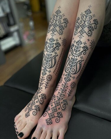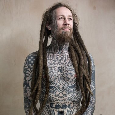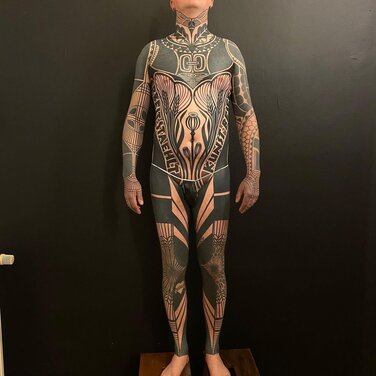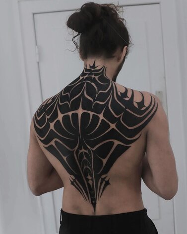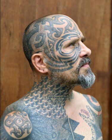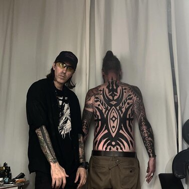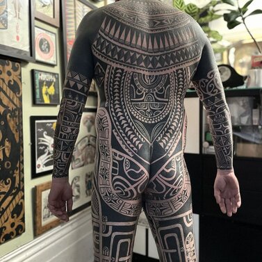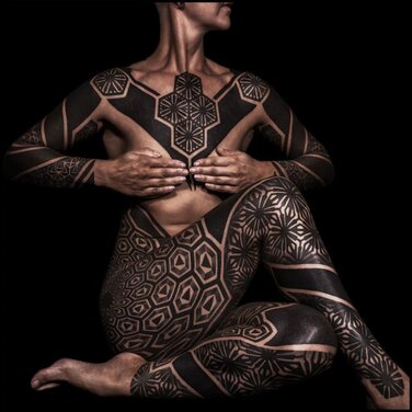 Simultaneously, as tribal aesthetics were recontextualized throughout the tattoo industry, Zulueta’s large-scale approach built steam in Los Angeles and London. In 1989, the publication Modern Primitives investigated the trend, situated alongside newly popular piercing practices, and in the 1990s London-based Alex Binnie, from his IntoYou studio, progressed and engaged a new generation of tribal-inspired artists: Xed Lehead, Tomas Tomas, Andreas 'Curly' Moore, and others. They, in turn, inspire people now associated with geometric tattooing — think Thomas Hooper and Jondix. Western artists like Chris Higgins honor indigenous ritual with faithful study and composition of Māori tattoos. In contrast, Black Symmetry evolves neo-tribal through engagement with psychedelic patterning, while Gerhard Wiesbeck draws from electronic circuits to develop his patterns. Cybersigilism, cyber tribal, and techno-tribal, all combining mysticism and cyber aesthetics, are among the latest aesthetic advances that owe greatly to neo-tribal tattoo influences.