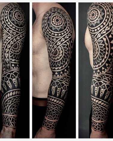 On the “true tribal” side, Polynesian motifs representing human form (Enata), the sky, niho mana, the spear, the ocean combine to form patterns that are commonly associated with tribal tattooing — especially in connection to Māori, Samoan and Hawaiian