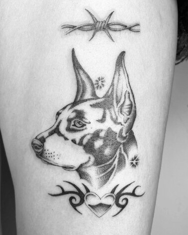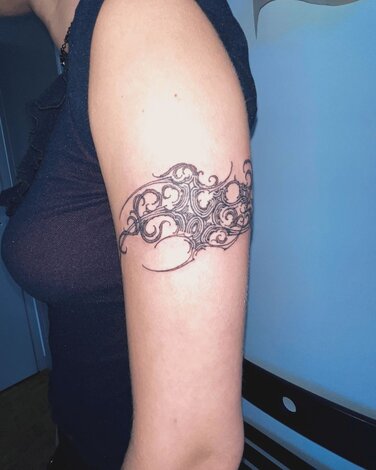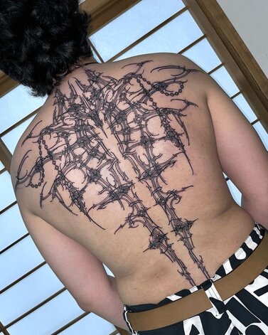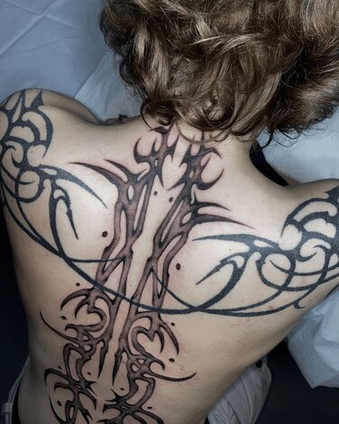 Tribal tattooing defies singular definition. The term as used today describes several different subgenres, and interpretations. It predominantly refers to the developments of a subgenre developed in the 1980s which borrowed from practices in Borneo, but removed from any true cultural symbolism. Spreading from the United States, inspired by Michigan-based Leo Zulueta, it quickly separated into two distinct currents: large-scale abstract work, also referred to as neotribal, later advanced in London with the likes of Xed Lehead, and spurred contemporary adjacencies inclusive of related blackwork, geometric tattooing, on one hand. And on the other hand, smaller ornamental motifs often looking like interlocking thorn-like structures. The latter eventually developing into today’s cybersigilism, combining technology and mysticism, and cyber tribal. In mass culture, a simplification of neotribal carries association to late ‘80s and ‘90s “tramp stamps,” applied to the tailbone, or bicep bands, among others. With Y2K nostalgia, we see some of this simplified tribal coming back into fashion too.