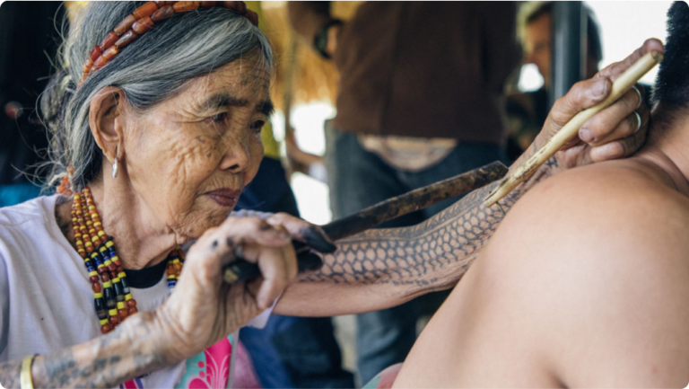 Whang-od, also known as Maria Oggay, is the last and oldest practitioner of Kalinga tattooing. At the age of 15, she began tattooing Butbut headhunters who traditionally earned tattoos from deeds in combat. Whang-od continues to practice traditional tattooing on tourists visiting Buscalan and interestingly is the oldest person to feature on the cover of Vogue.
